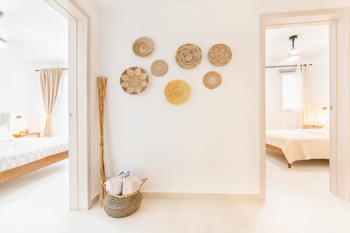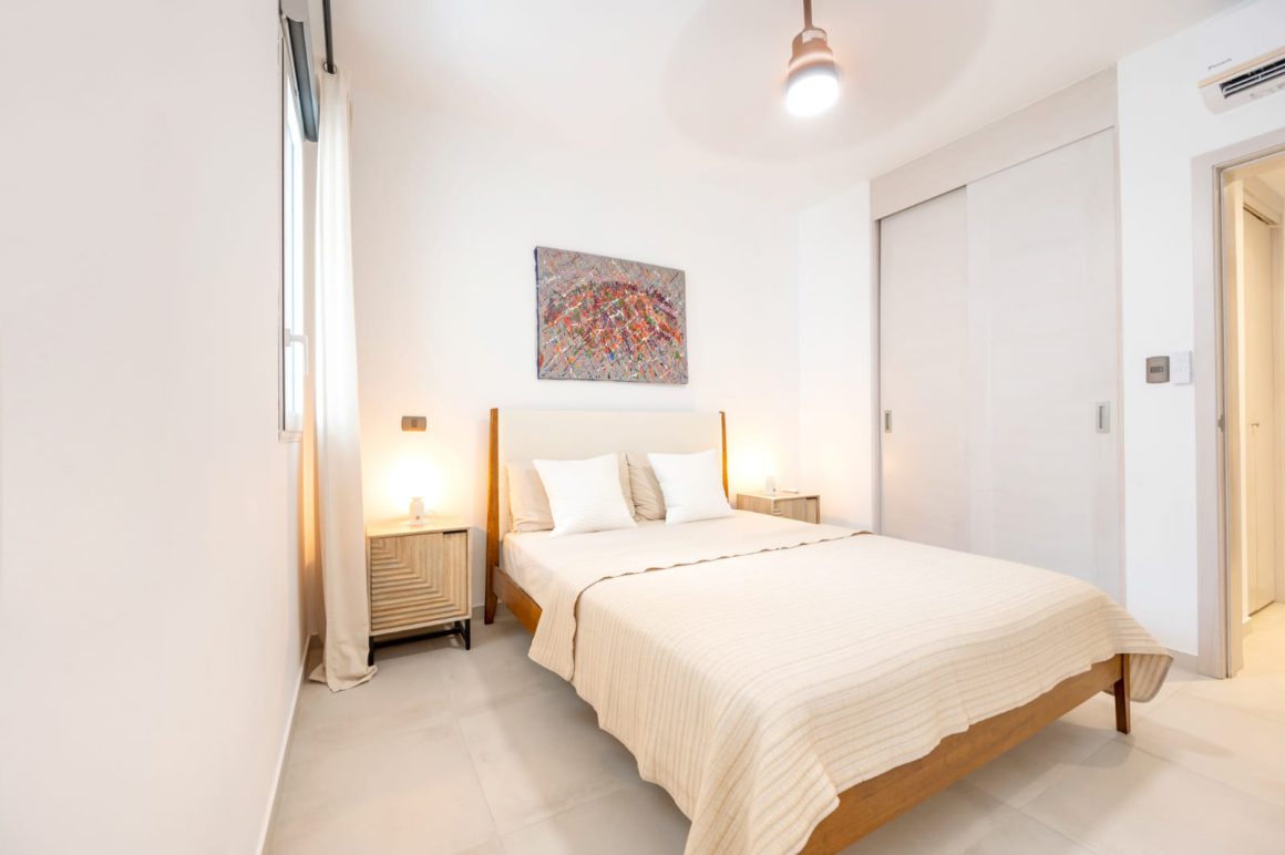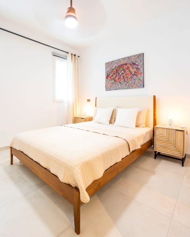 Apartament HYDRA 103 oferuje przestronne i luksusowe wnętrza zaprojektowane z myślą o najwyższym komforcie. Główna sypialnia jest wyposażona w łóżko typu king-size, dużą szafę, wentylator, klimatyzację oraz prywatny taras. To idealne miejsce na relaks po całym dniu spędzonym na słonecznych plażach. Druga sypialnia posiada wygodne łóżko typu queen-size, wentylator sufitowy, klimatyzację i przestronną szafę, zapewniając równie komfortowe warunki do wypoczynku.